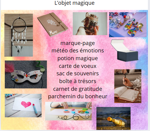 - Création d’un chef-œuvre, en lien avec les émotions ressenties. Cette réalisation est individuelle et pourra être un objet magique, source de bien-être, outil de réconfort.