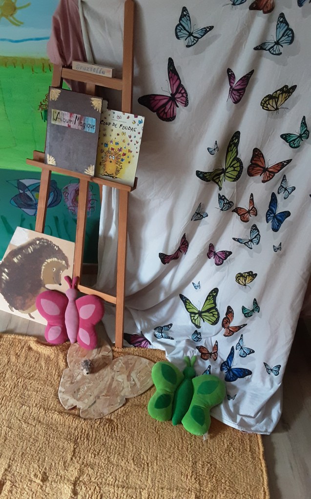 Exemple de coin lecture, espace détente mis en scène d’après le livre choisi. Ici : « Coup de Foudre » de Grégoire Solotareff